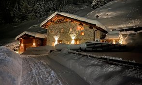 Ristrutturazione vecchio fabbricato rurale con trasformazione in baita. Il piano terra è stato realizzato con muratura in pietrame tradizionale mentre il piano primo è stato realizzato con tronchi di larice grezzo (blockbau). Una buona coibentazione interna consente di sfruttare l'edificio anche nei rigidi mesi invernali.
